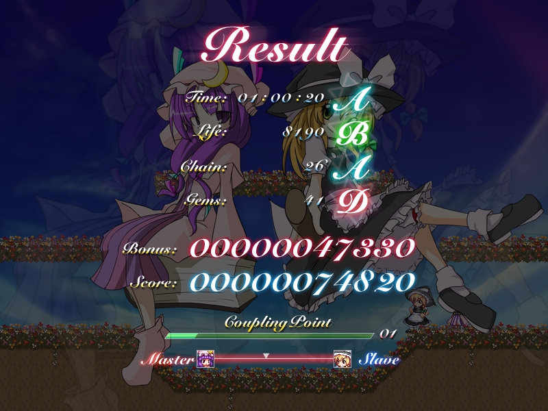 Gra prezentuje 4 poziomy trudności, znane klasycznie z każdej mozliwej gry touhou: Easy, Normal, Hard i oczywiście Lunatic. Każde wykonanie stage'a jest oceniane w rangach od poziomu S (najlepszego) stopniowo schodząc na niższe: A, B, C, D i E. Rangi sa przyporządkowywane do czterech kategorii związanych z ukończeniem poziomu: do czasu ukończenia, do ilości utraconych punktów życia, do umiejętnego łączenia ataków (chain) oraz do ilości zdobytych klejnotów wypadajacych z pokonanych przeciwników. Gameplay jest bardzo dynamiczny i wymaga sporej dozy refleksu i dobrej umiejętności panowania nad swoimi postaciami. Gra daje sporo pola do popisu graczom w taki sposób, że każdemu łatwo ukształtować własny unikalny styl walki. Taka elastyczność to duży plus. Ilość ataków jest wystarczająco duża, by być w stanie przeróżnie manewrować akcją dziejącą się w poziomie na swoją korzyść. Większość umiejetności jest czysto zaczerpnięta z oficjalnych bijatyk touhou, jak np. SWR, to jest widoczne jak na dłoni już po kilku minutach grania, więc twórcy w tym względzie nie popisali się szczególną oryginalnością zwłaszcza, że nie mamy do dyspozycji tak bogatego arsenału jak w np. Hisoutensoku. Olbrzymią zaletą są natomiast boss fighty. Są niezwykle ciekawe, czasami mają niezłe elementy humorystyczne, wymagają od gracza dość sporo. Na nudę trudno w tej grze narzekać.